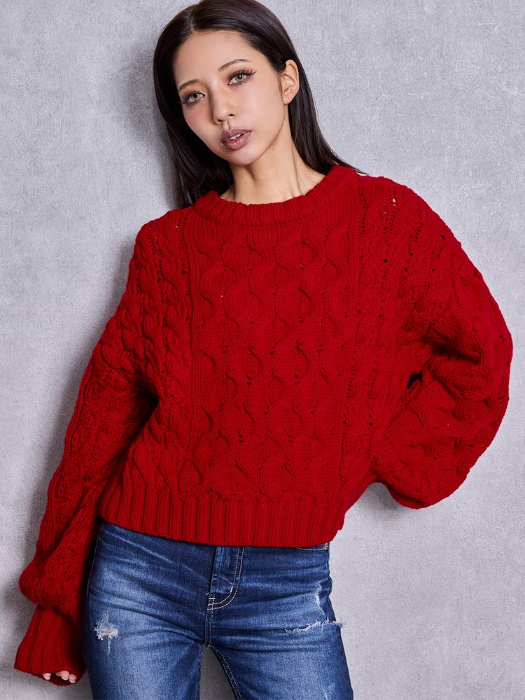 ケーブルクルーネックニットトップス